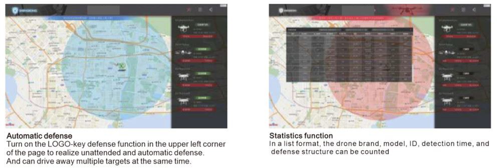Για εισβολείς drones, μπορείτε να επιλέξετε: Ένα-κλειδί αυτόματης άμυνας: Αφού ενεργοποιηθεί η λειτουργία άμυνας του συστήματος, το μη επανδρωμένο drone θα υπερασπιστεί αυτόματα το σύστημα χωρίς προσωπικό σε υπηρεσία. Χειροκίνητη παρέμβαση: Μπορείτε να επιλέξετε χειροκίνητα την υπεράσπιση οποιουδήποτε drone και τον τρόπο άμυνας του χρόνου ή να διακόψετε την άμυνα και μπορείτε να επιλέξετε να εντοπίσετε τον πιλότο.